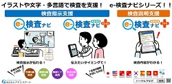 がん検診で行われるX線検査の指示は、音声のみで行われています。そこで、「指示内容が見える」ようにX線検査支援システム『e-検査ナビシリーズ』(胃部X線検査、胸部X線検査・胸部CT検査、乳房X線検査)を製品化しました。多言語に対応しており、「見える指示」により聴覚障害者や日本語がわからない外国人だけでなく、健聴の被検者も安心してがん検診を受診できるようになります。