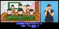 聴覚障害の有無にかかわらず、正しいがんの知識を広げるためにがん教育の一環として、(公財)日本対がん協会と(福)聴力障害者情報文化センターと連携し字幕と手話付きの動画教材を制作、DVD化し、全国のろう学校や聴覚障害者情報提供施設等に寄贈しました。また、墨田区保健計画課・障害者福祉課、東京都予防医学協会と連携し、聴覚障害者のがん検診の受診機会創出にも尽力しています。