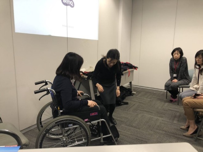「心のバリアフリー」の理解を深めるため、JALグループ全社教育とは別に、車椅子の試乗体験、高齢者や視覚障害者の体験グッズを利用した独自の教育を行っています。高齢のお客様や障害、慢性疾患のあるお客様への気付きを得て、日常的にコミュニケーションが取れる魔法の言葉「お手伝いいたしましょうか」を伝えています。サービス介助士やユニバーサルマナー検定の取得も推進しています。