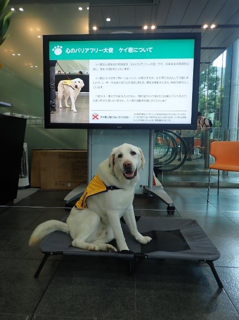 介助犬を引退した「ケイ君」を特別社員「心のバリアフリー大使」に任命し、本社ビルや首都圏の他事業所で触れ合い活動やデモンストレーション、昼休憩時に盲導犬の歩行体験などを行い心のバリアフリーの啓発活動に取り組んでいます。社員が補助犬やバリアフリーの理解を深めることにつながっています。受付横でも活動し、社員だけでなく来社されるお客様にも補助犬について知っていただく機会となっています。