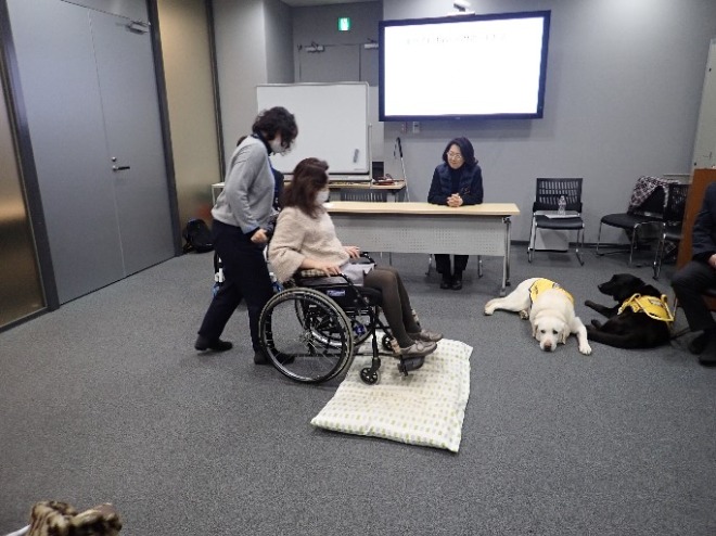 セミナーでは障害当事者の講師によるサポート方法の説明や補助犬と共に行う体験型の講習を行い、参加者に気付きを促しています。またケイ君が出社した際に、来客対応中の社員がお客様に取組を紹介している姿も見受けられ、少しずつ認知を深めています。